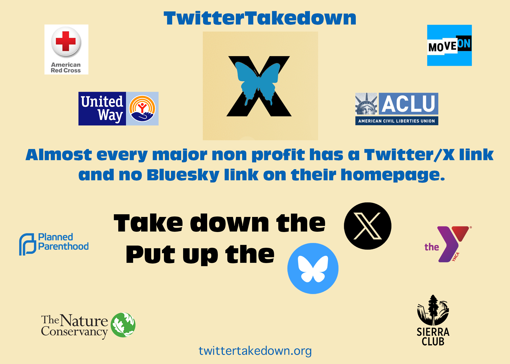 Many people upset about how bad Twitter has become are deleting their accounts. Wanting to delete your X, FB, IG, and threads account makes sense! But to really grow the TwitterTakedown we need to reach the people still there. We are asking activists to post on Twitter about how everyone should leave and come to Bluesky. The only thing an X account is good for is posting about the TwitterTakedown!